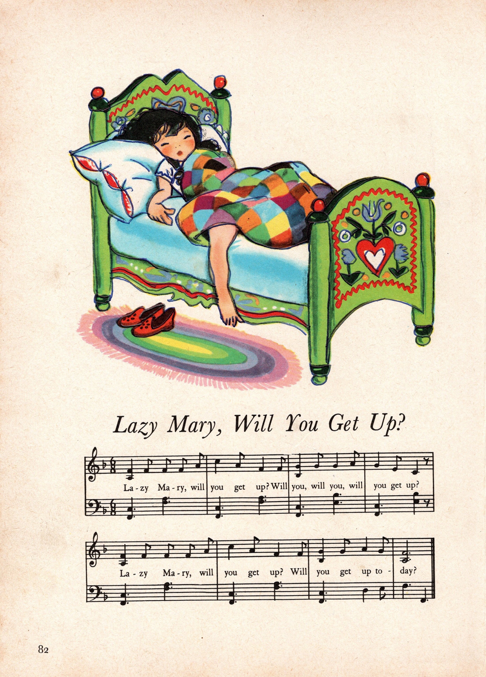 So I naturally assumed that this song was about Mary not wanting to get out of bed either through illness or the lack of a husband. The prospect of “A nice young man with rosy cheeks,” was a sure motive for her to ‘get up’